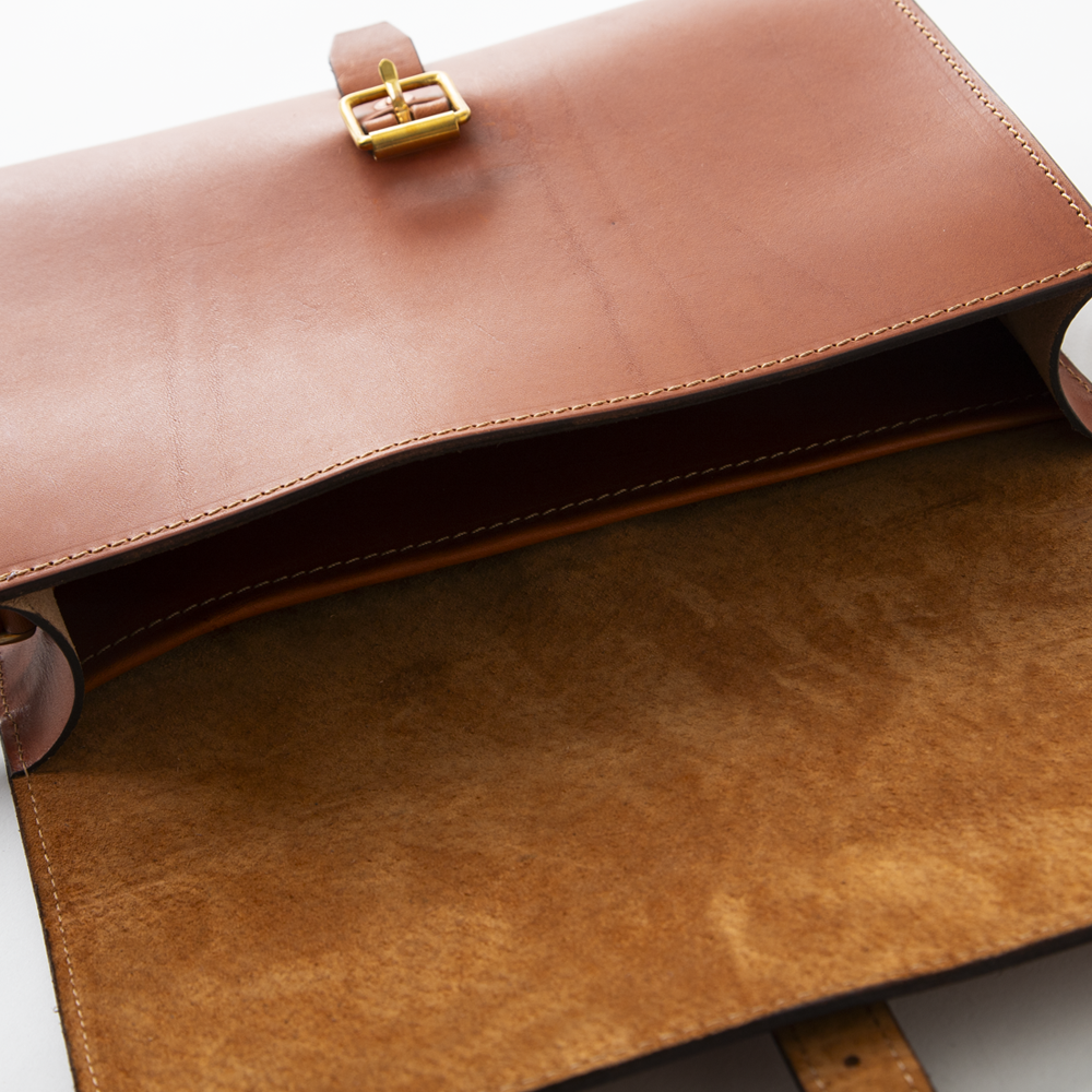 フラップはセンターの真鍮バックルで留めるシンプルな構造で開けるとスエードの裏地が付いています。