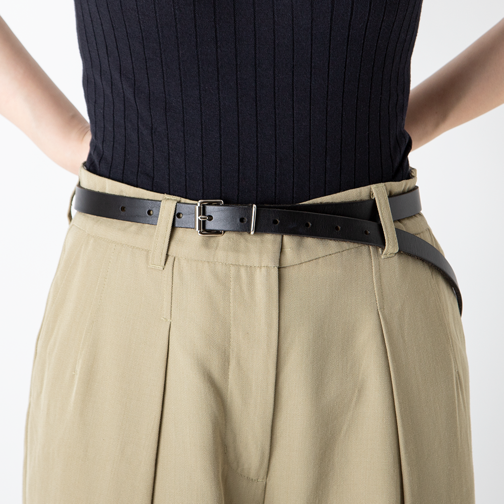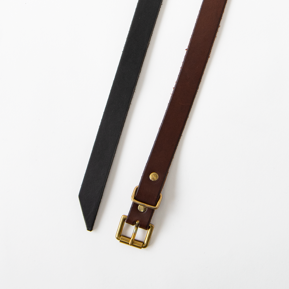 樹皮なめしのイタリア製フルグレイン レザーを厚さ 3.5 mm の皮から 1 ピースにカットしたナローベルト。