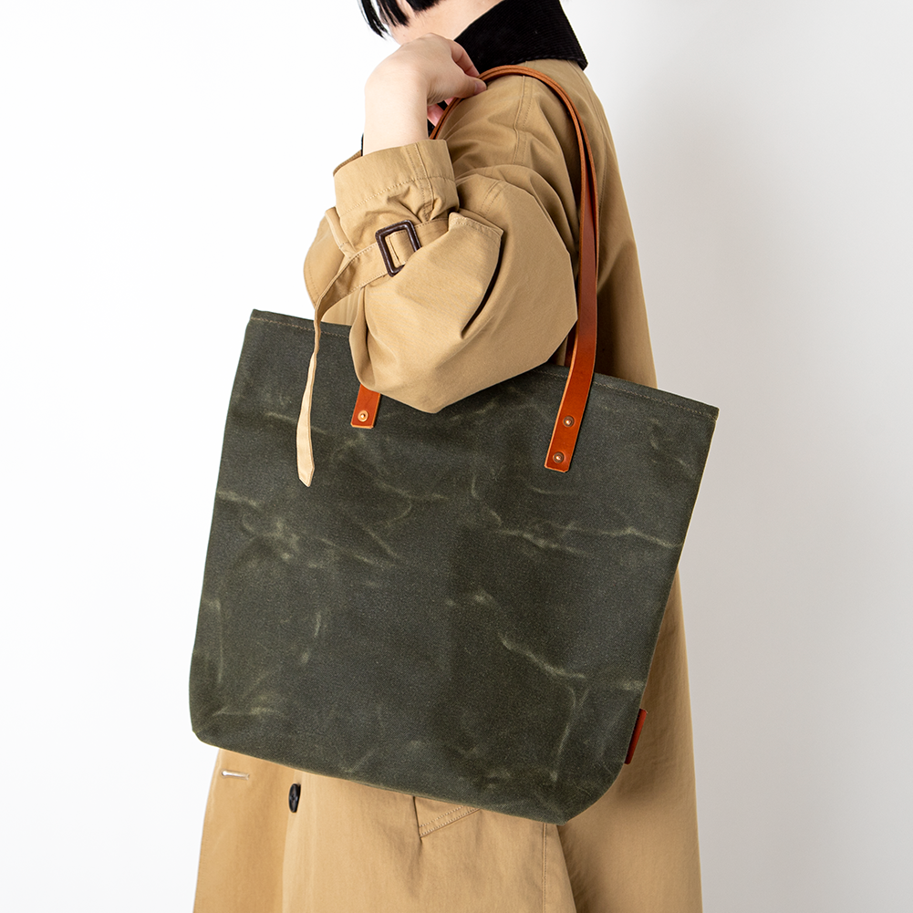 スコットランドの老舗ファブリックメーカー『ハリー・スティーブンソン社』の18オンスのワックス加工のキャンバス生地に、フルグレインの植物タンニンなめしイタリアンレザーを組み合わせたトートバッグ。