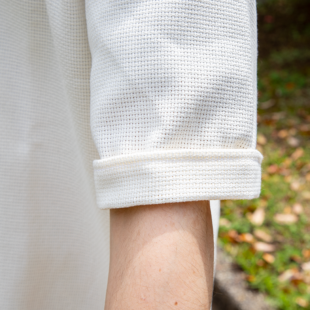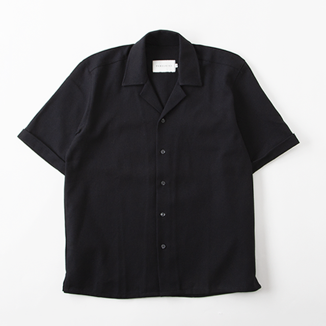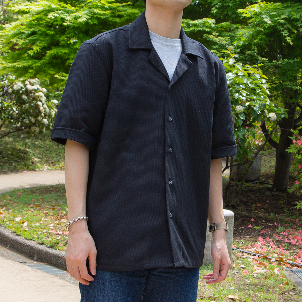 最大の特徴は何といってもバスケット織のメッシュ生地。 涼しげな透け感のある生地のアイテムは近年人気が高まっていますね。 デザインは開襟のキューバシャツ。フロントに特徴的な柄のないシンプルなデザインとなっています。