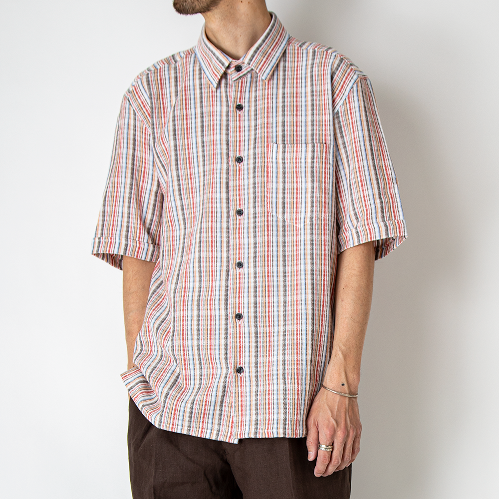 シアサッカー生地のブルーストライプ、特徴的な柄・配色のキャンディーストライプの2色入荷しました。 どちらも存在感のある柄ですので、Tシャツの上に羽織るだけでも◎。