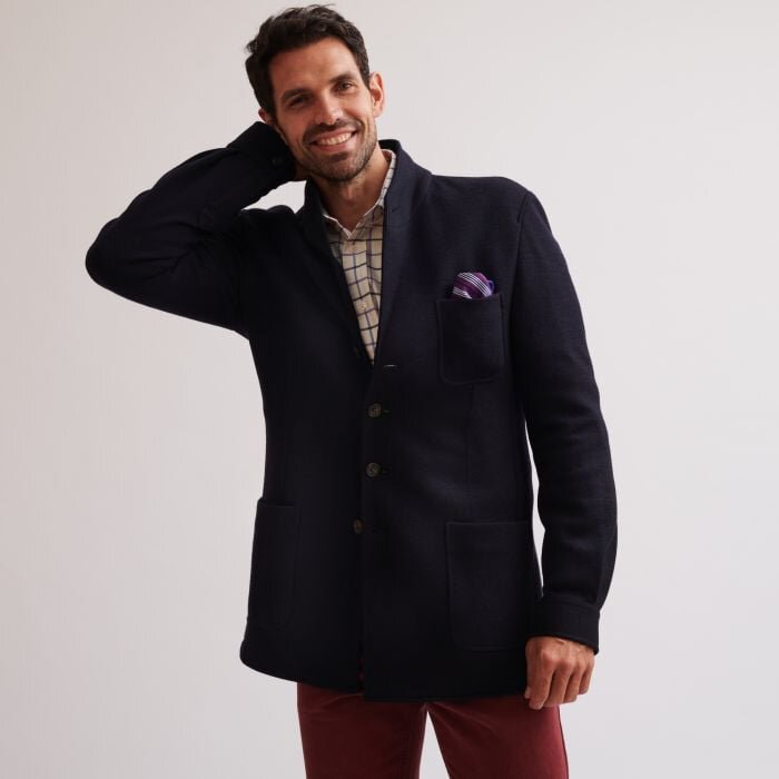 コーディングスのテバジャケットはウールのニット生地を使用。暖かく、軽くて動きやすい、カジュアルな着こなしもできる万能ジャケットです。