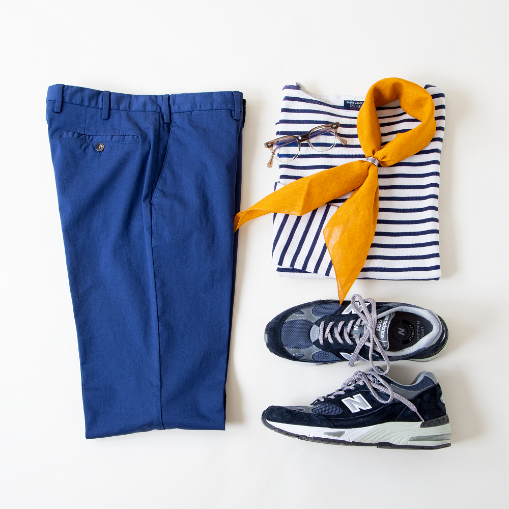 足元は革靴ももちろん相性がよいですが、今回はニューバランスでよりカジュアルに合わせました。
