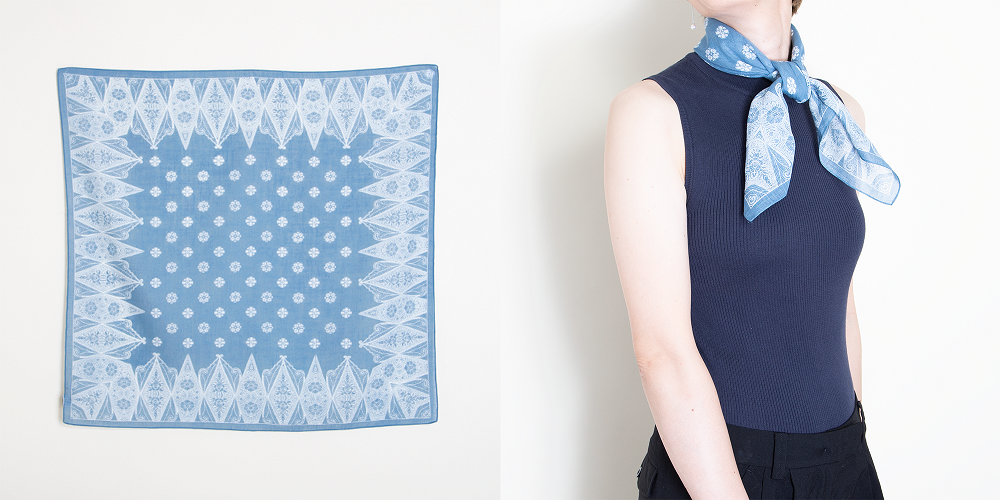使いやすい65センチの正方形なので、首元だけでなく、ヘアアクセサリー、バッグのアクセントとしてご利用頂けます。