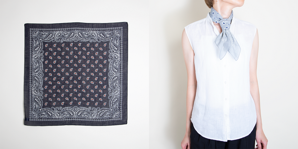 定番のペイズリー柄を用いたコットンリネン素材のスカーフ。