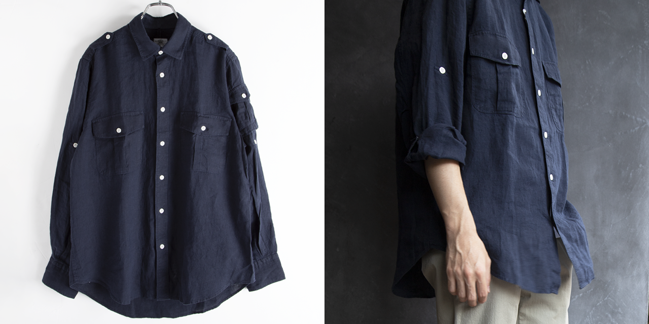 シンプルなヴィンテージリネンシャツとは対照的なサファリリネンシャツ。