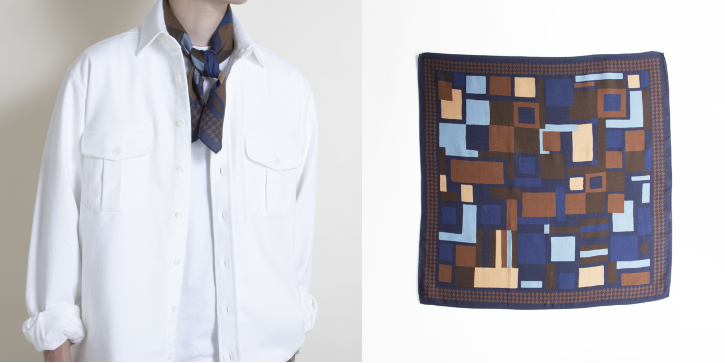 スクエアモチーフと千鳥格子のプリントスカーフ。