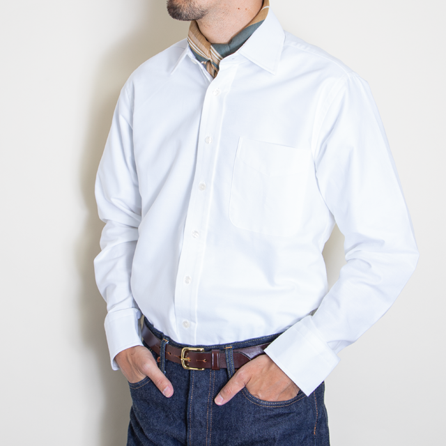 硬すぎない生地感で癖のないクリーンなイメージでドレススタイルにもカジュアルにも合わせやすい万能シャツです。