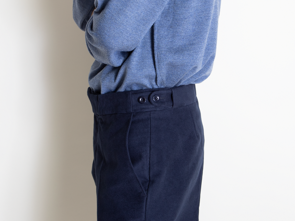 サイドの釦でウエスト調整可能で、更に内側にはブレイシーズ(サスペンダー)用の釦が付きます。