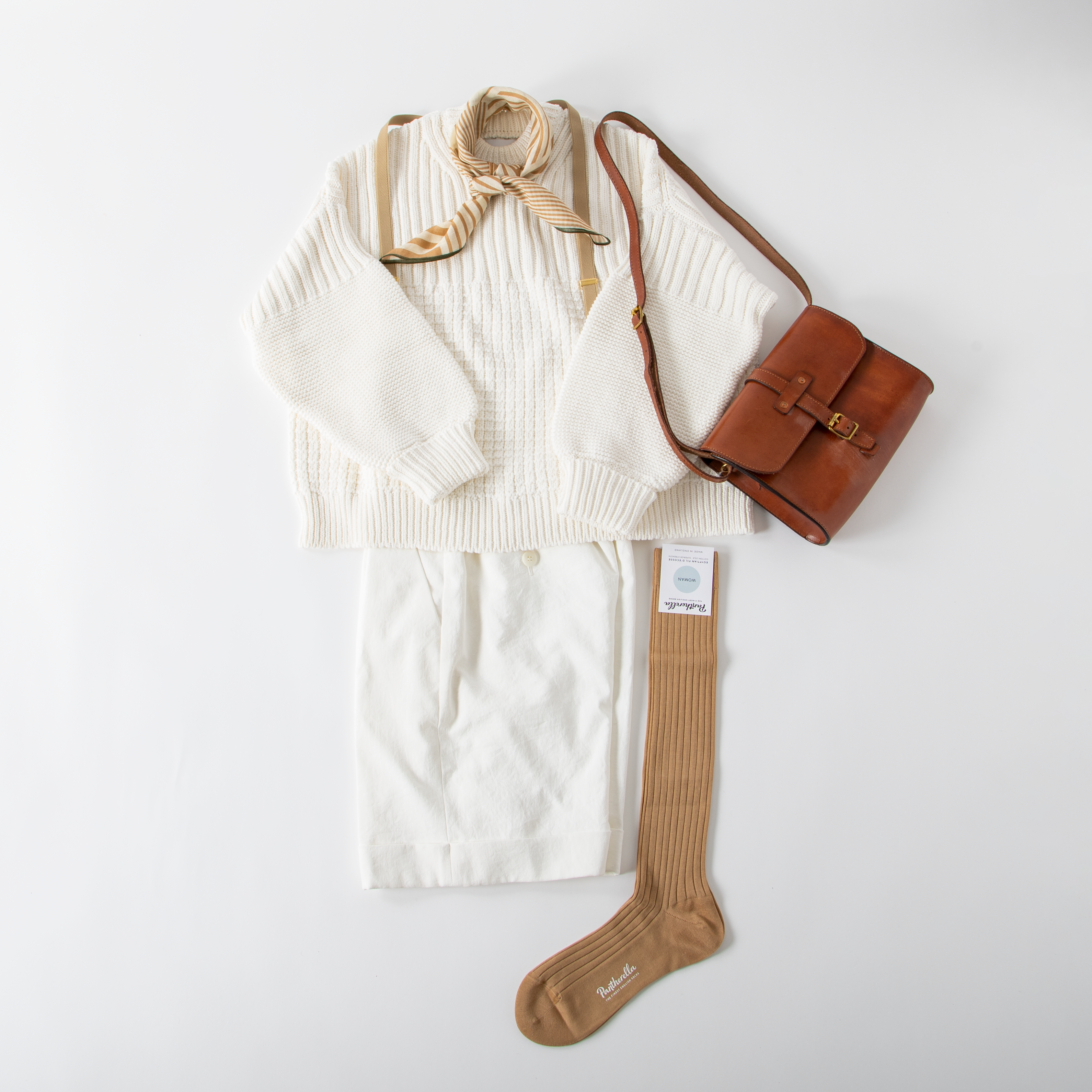 ホワイトコーデの挿し色にベージュのスカーフを合わせてみました。