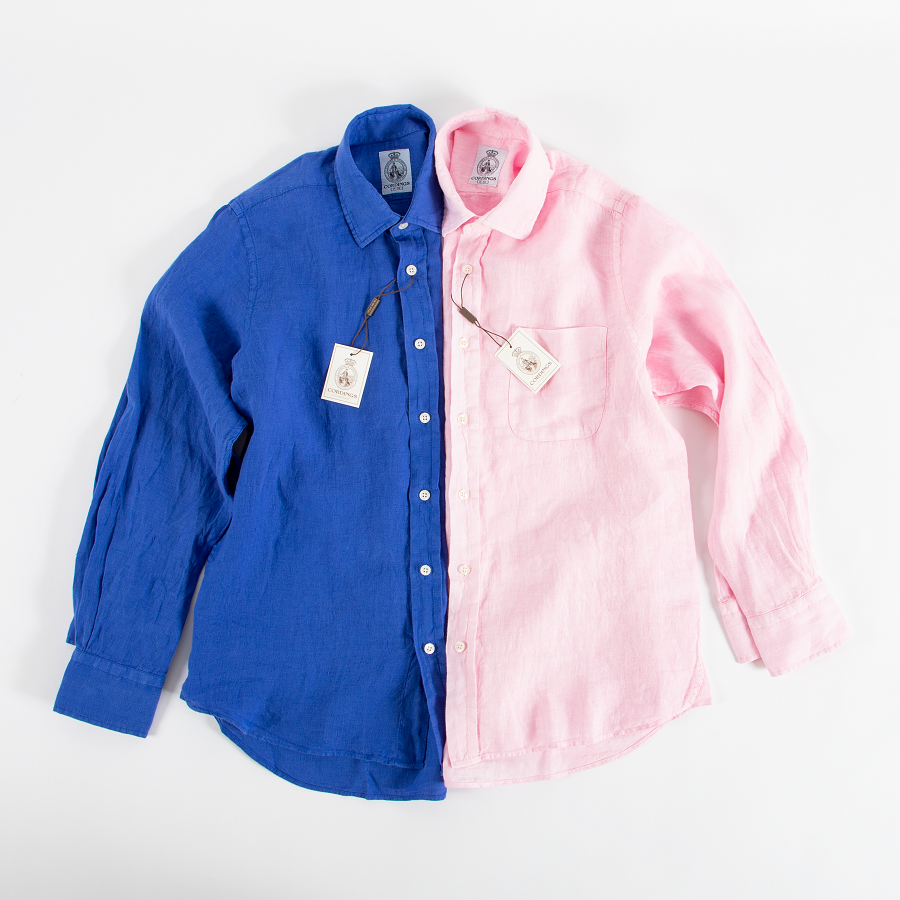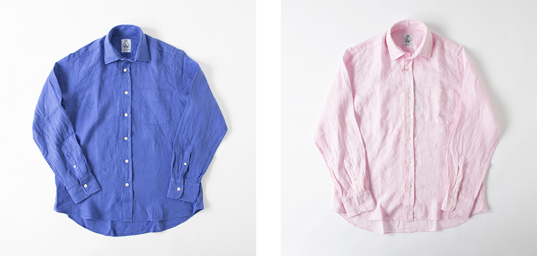 画像左がCobalt Blue,画像右はPink。 既に仕上がって形になった製品を後から染める手法ガーメントダイ加工で、独特の雰囲気が抜群で一枚で着ても様になるシャツです。 デニムやショートパンツとカジュアルに合わせるのは勿論、アイロンを掛けてジャケットなどに合わせるスタイルもおすすめです。