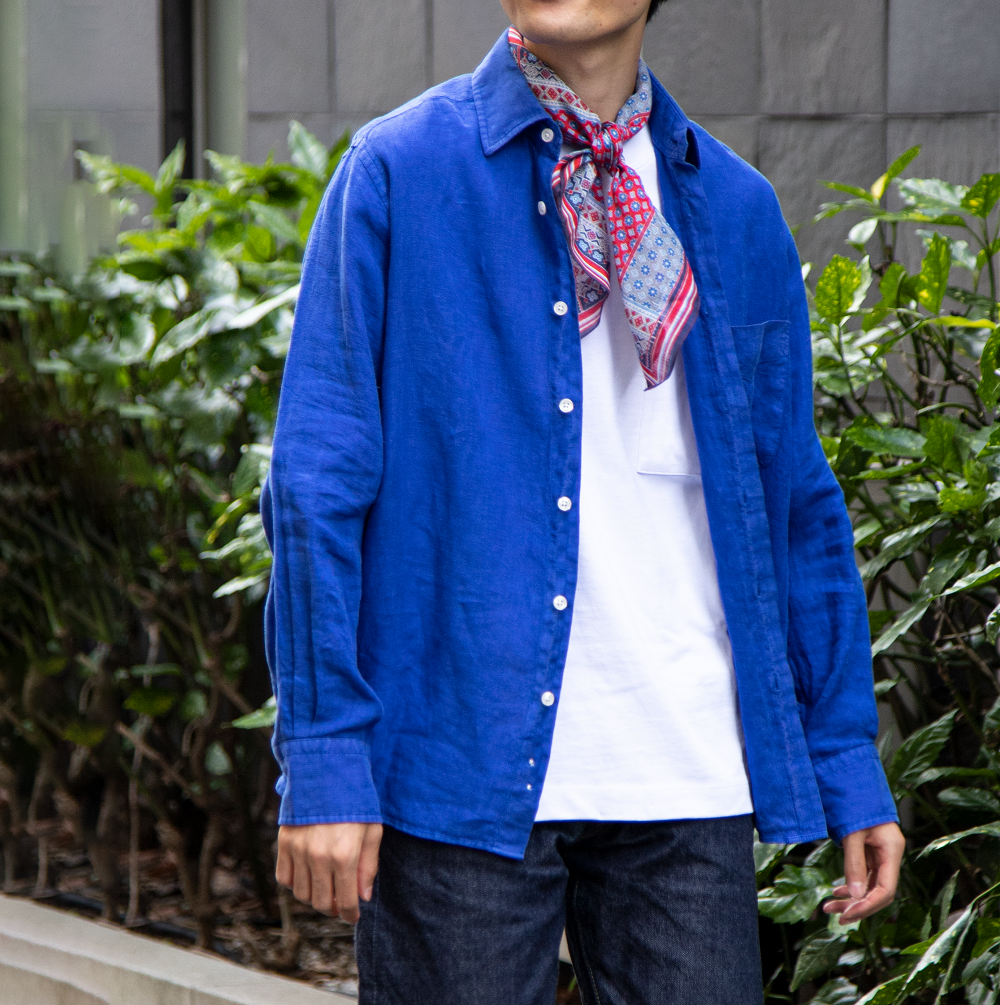 製品染めされたリネンは独特な風合いに仕上がっており、表情も豊かで羽織るだけで様になります。