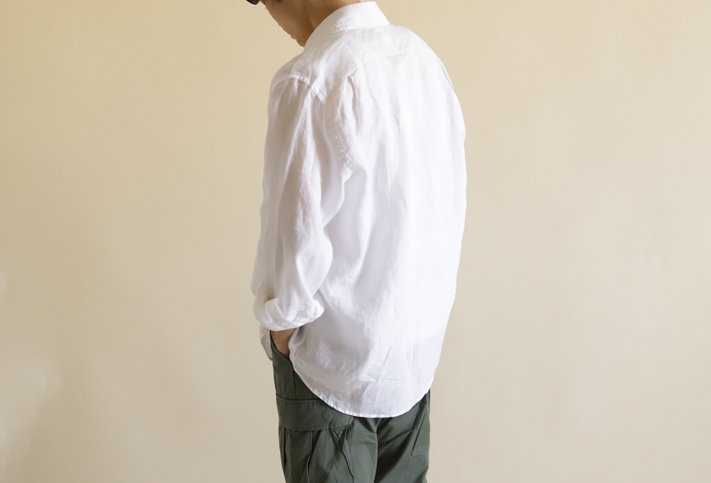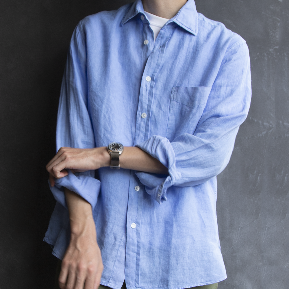 スタンダードなリネンシャツは着まわしやすいシンプルな1枚。