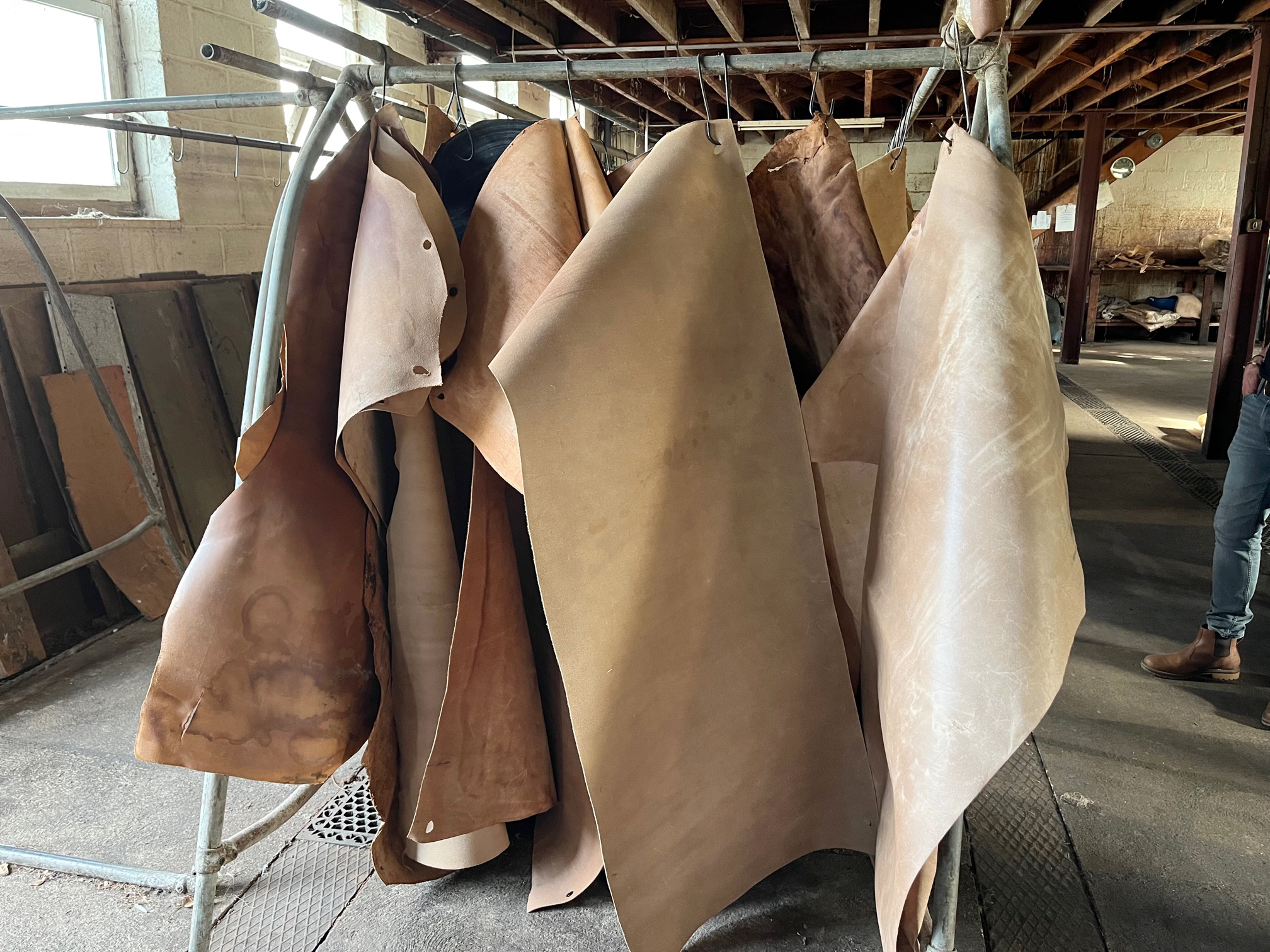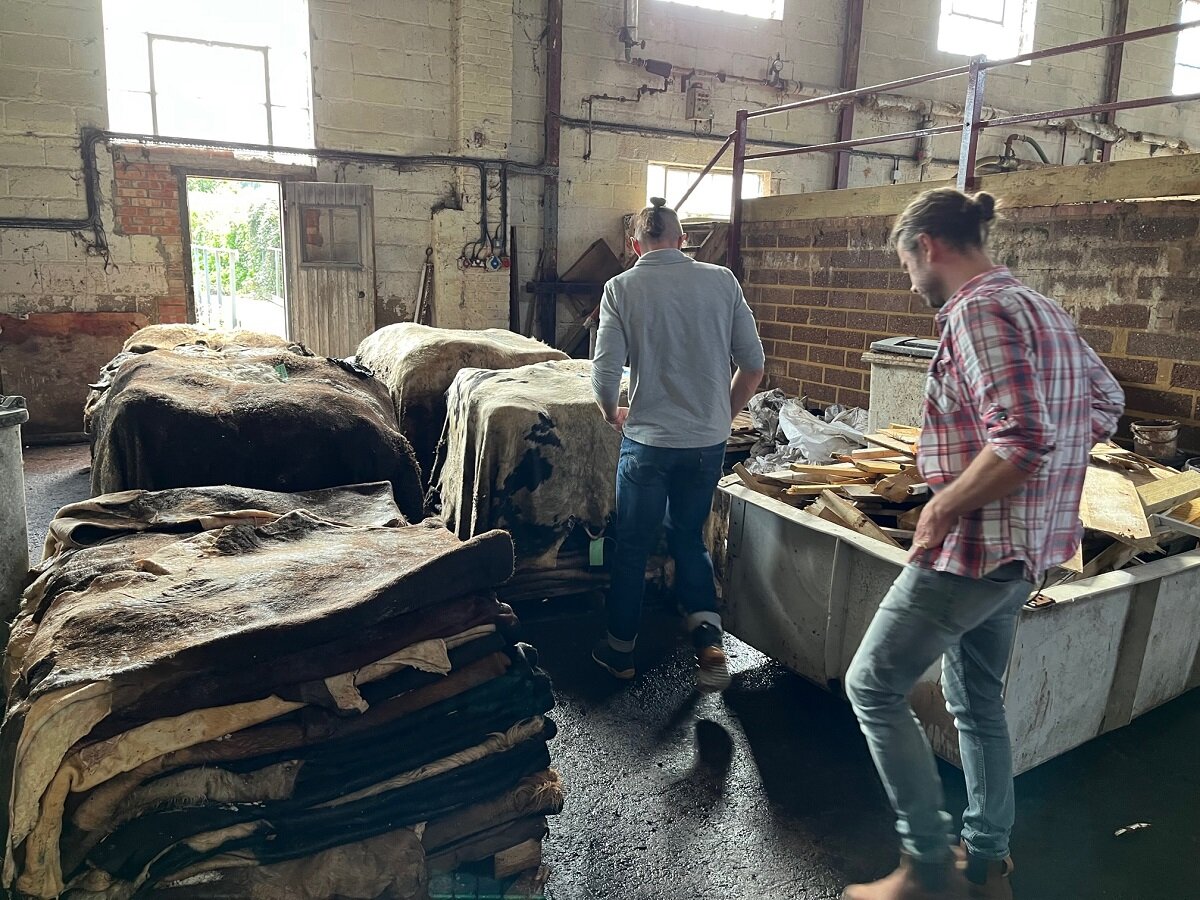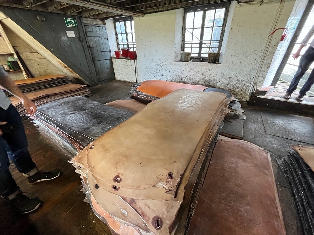 このプロセスだけで数週間かかるそうです。 皮はデボン牛から調達されており、食肉産業の副産物。