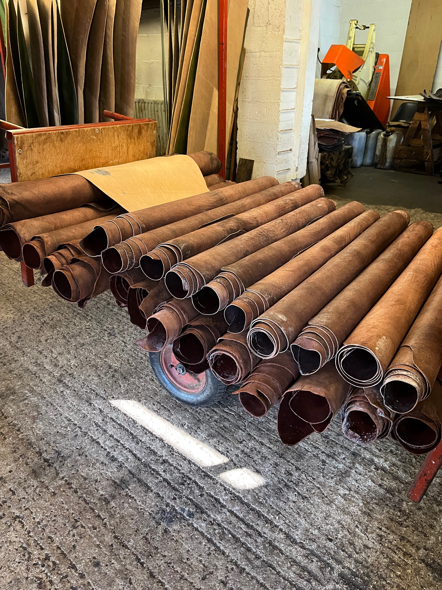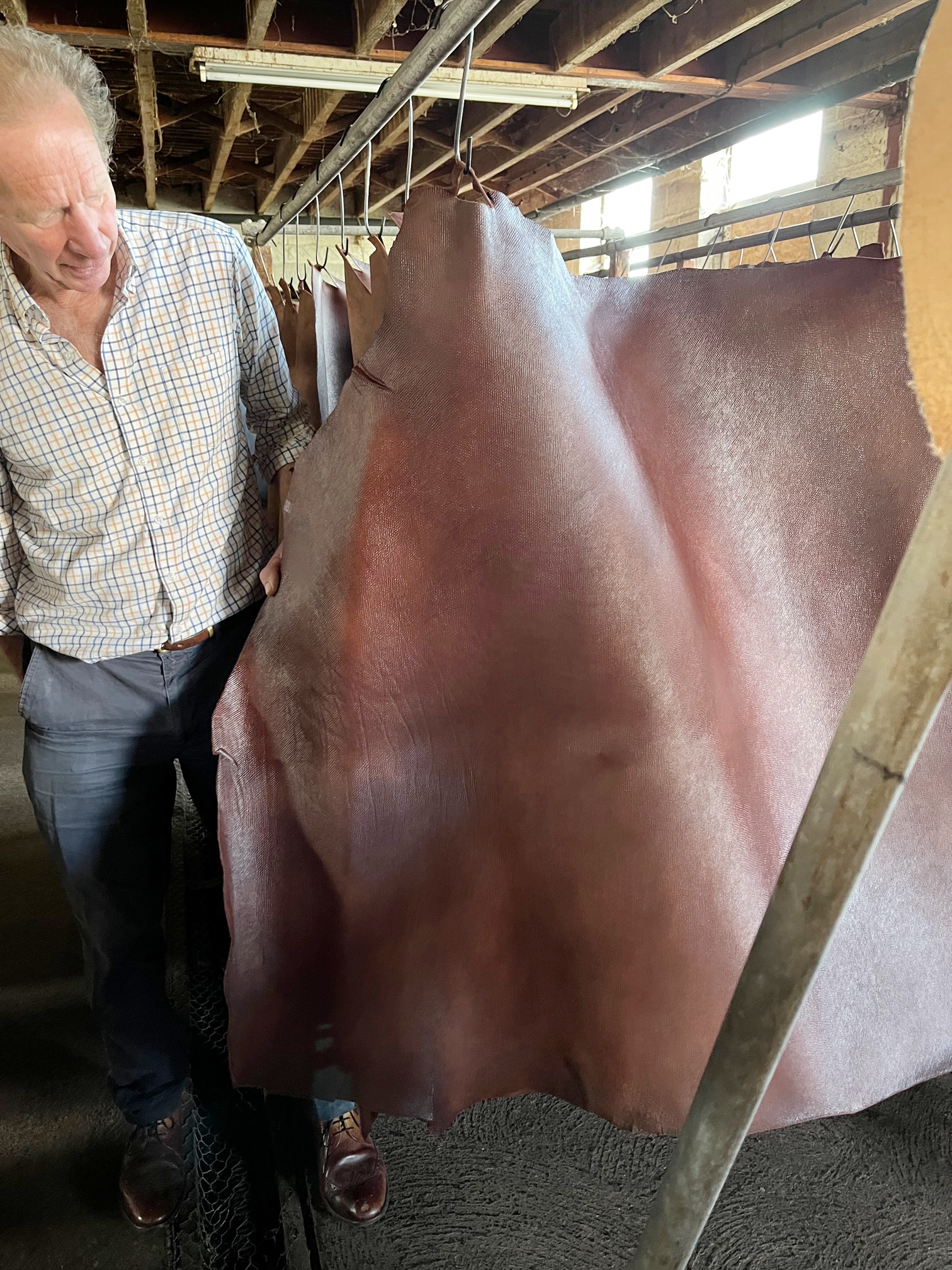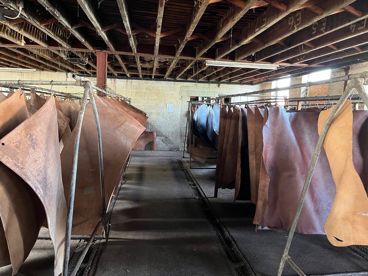 このプロセスだけで数週間かかるそうです。 皮はデボン牛から調達されており、食肉産業の副産物。