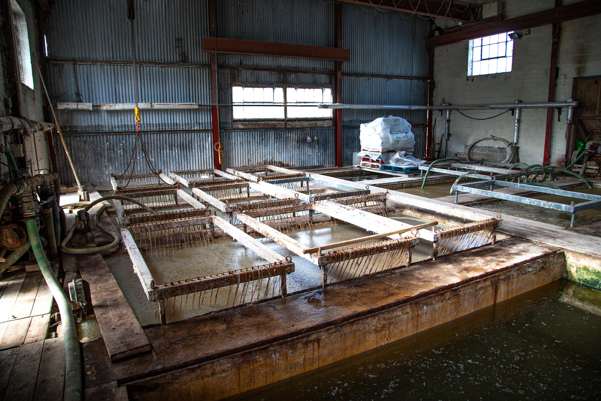 使われるオーク樹皮は木材産業の廃棄物で、3年間乾燥させた後、水車を動力とする機械で粉砕されます。