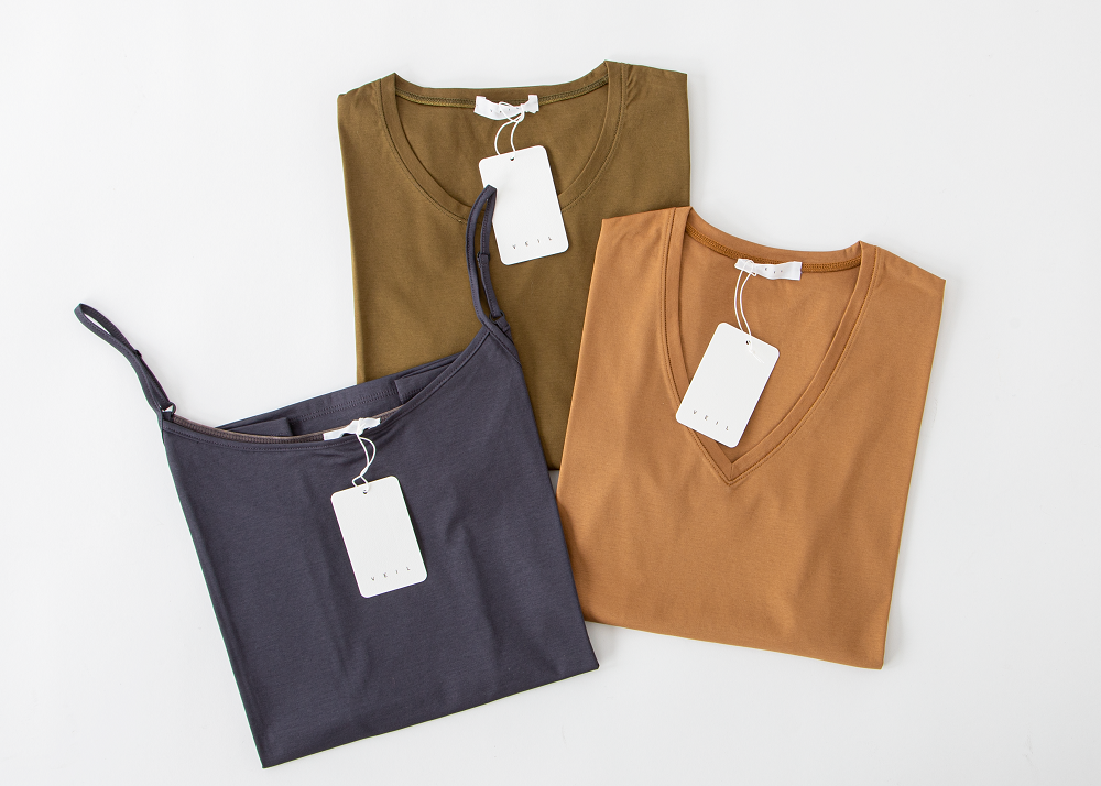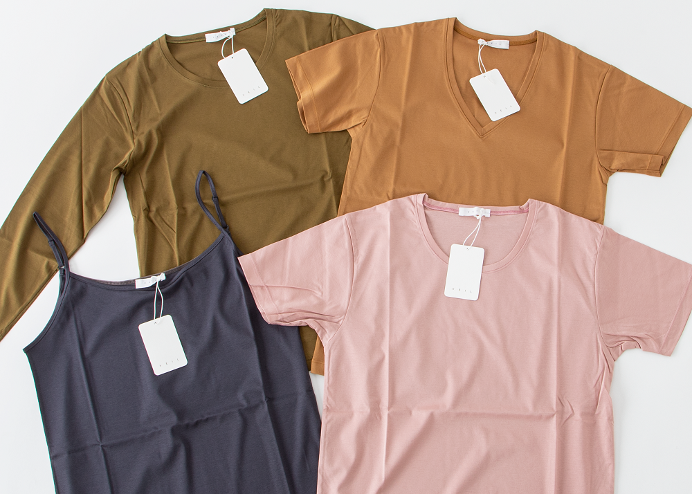 型はクルーネック長袖、クルーネック半袖、Vネック、キャミソールの4型。