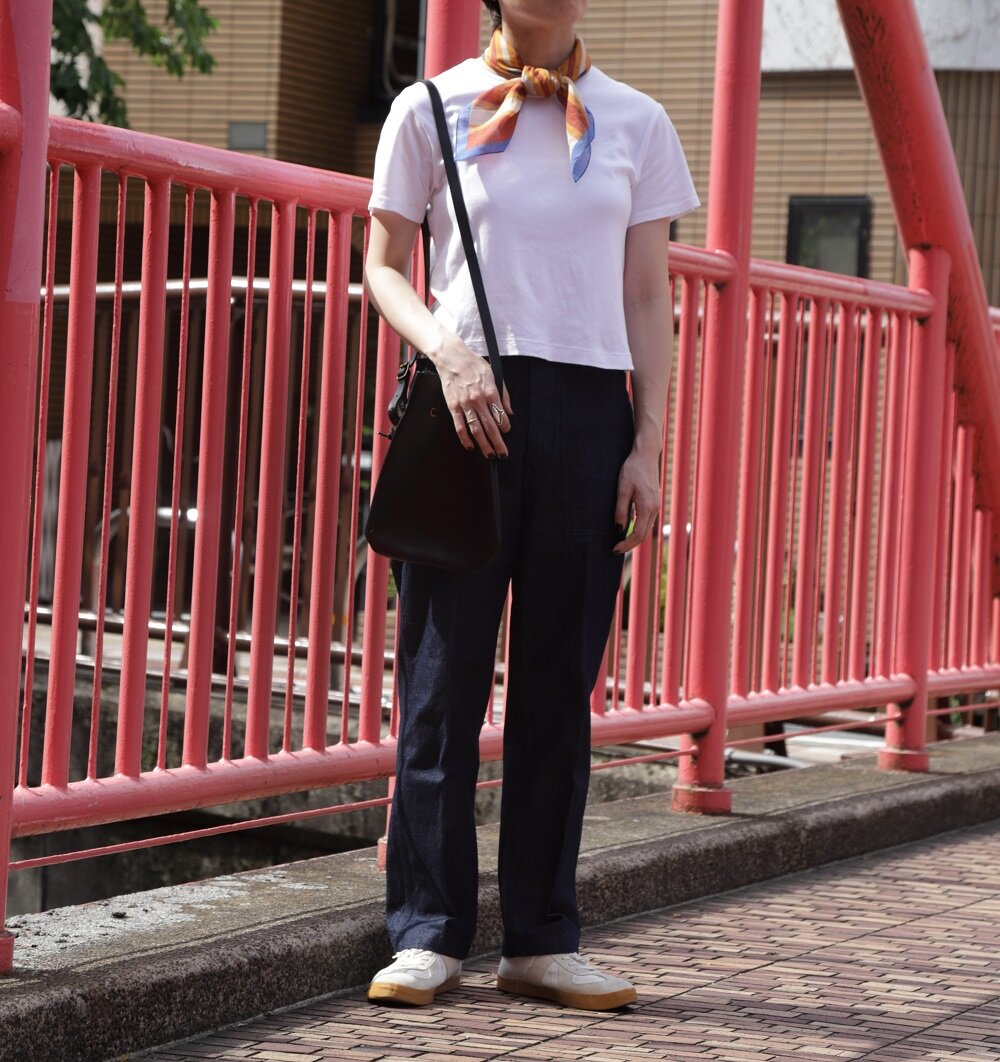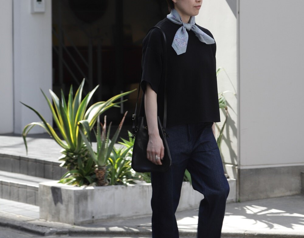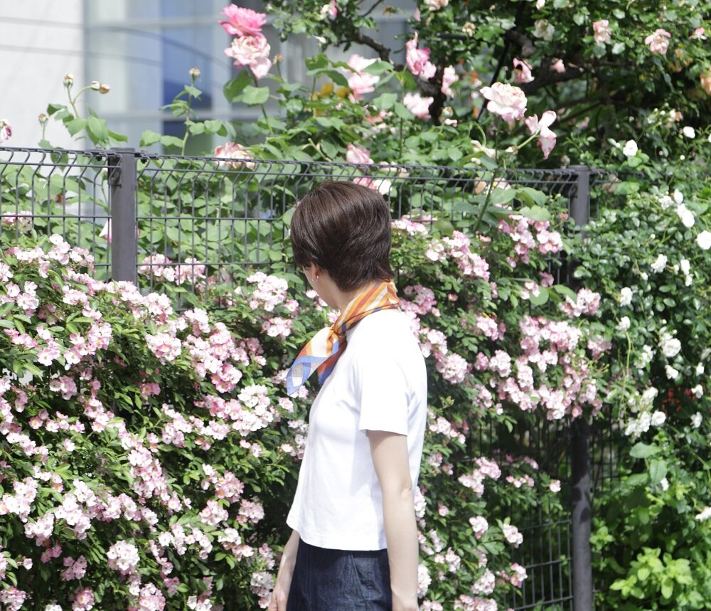 Vincenzo Miozza コットンリネン スカーフ JF037542 ¥12,100 (税込)派手目に見える柄ですが、付けると馴染みやすくこなれ感を演出してくれます。