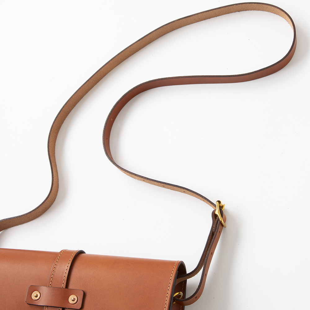 サイドには長いレザーストラップが付いているので、肩にかけたり、斜めがけしたりすることもできます。