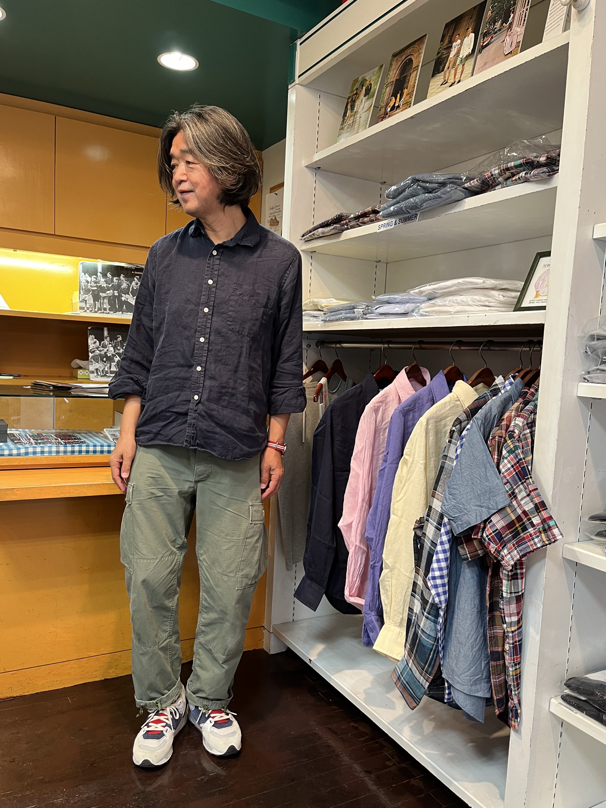 春夏はカーゴパンツにCORDINGSのリネンシャツを組み合わせた八木沢様のスタイルが素敵でした。