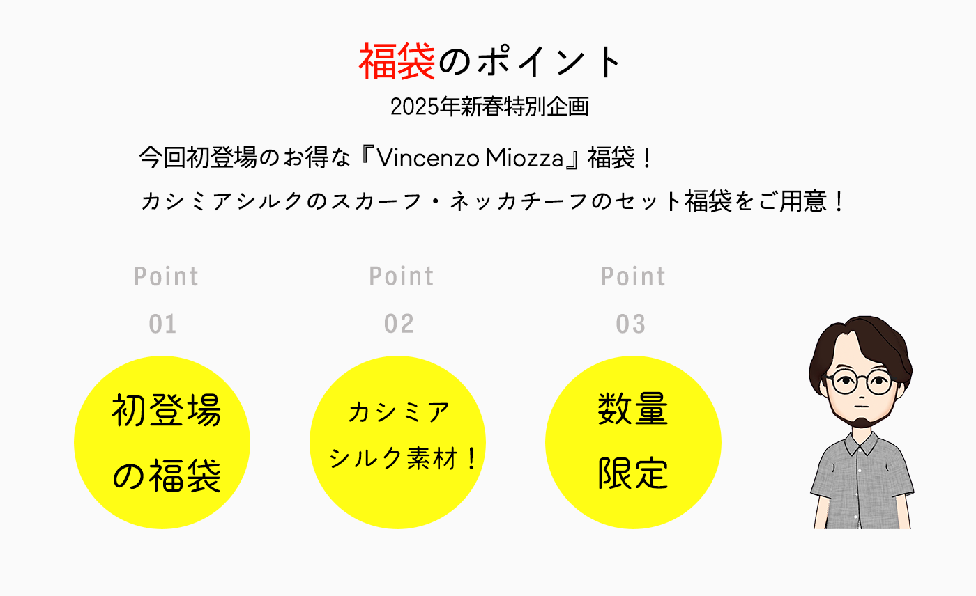 今回の福袋は『Vincenzo Mioozaの』スカーフ・ネッカチーフがセットになった福袋!