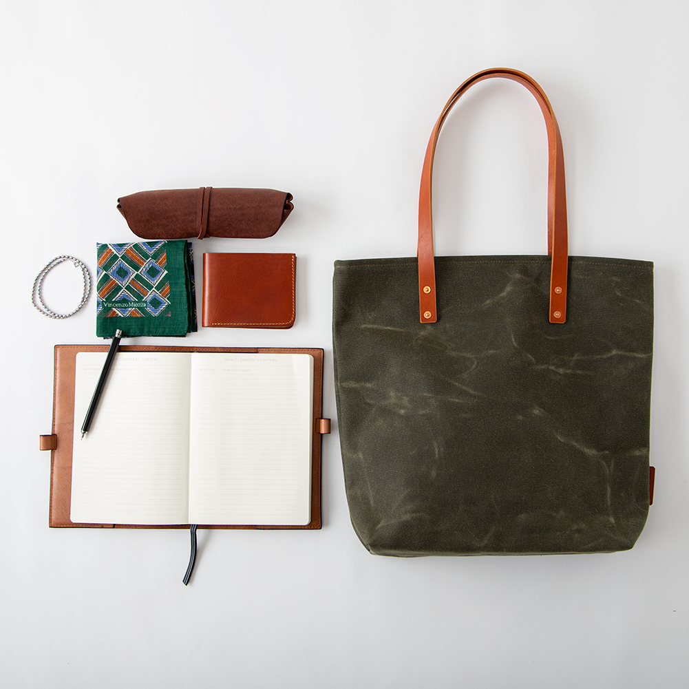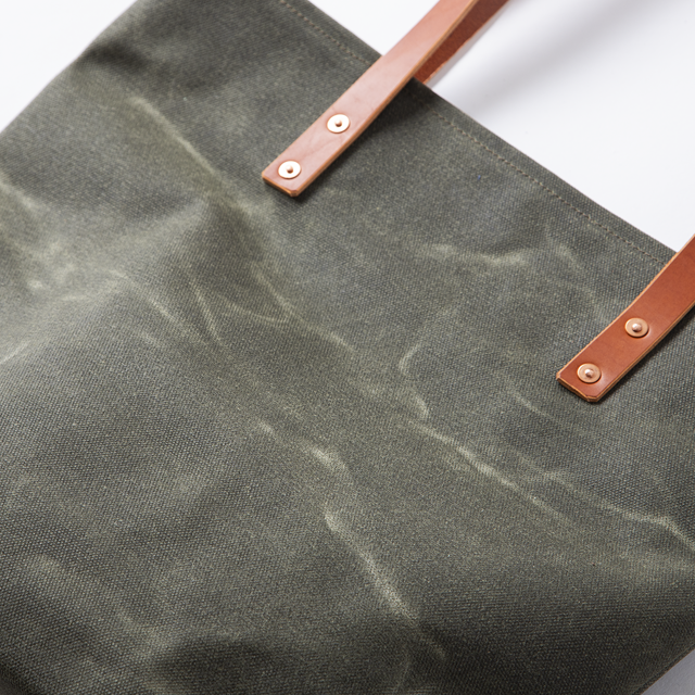 スコットランドの老舗ファブリックメーカー『ハリー・スティーブンソン社』の18オンスのワックス加工のキャンバス生地に、フルグレインの植物タンニンなめしイタリアンレザーを組み合わせたトートバッグ。