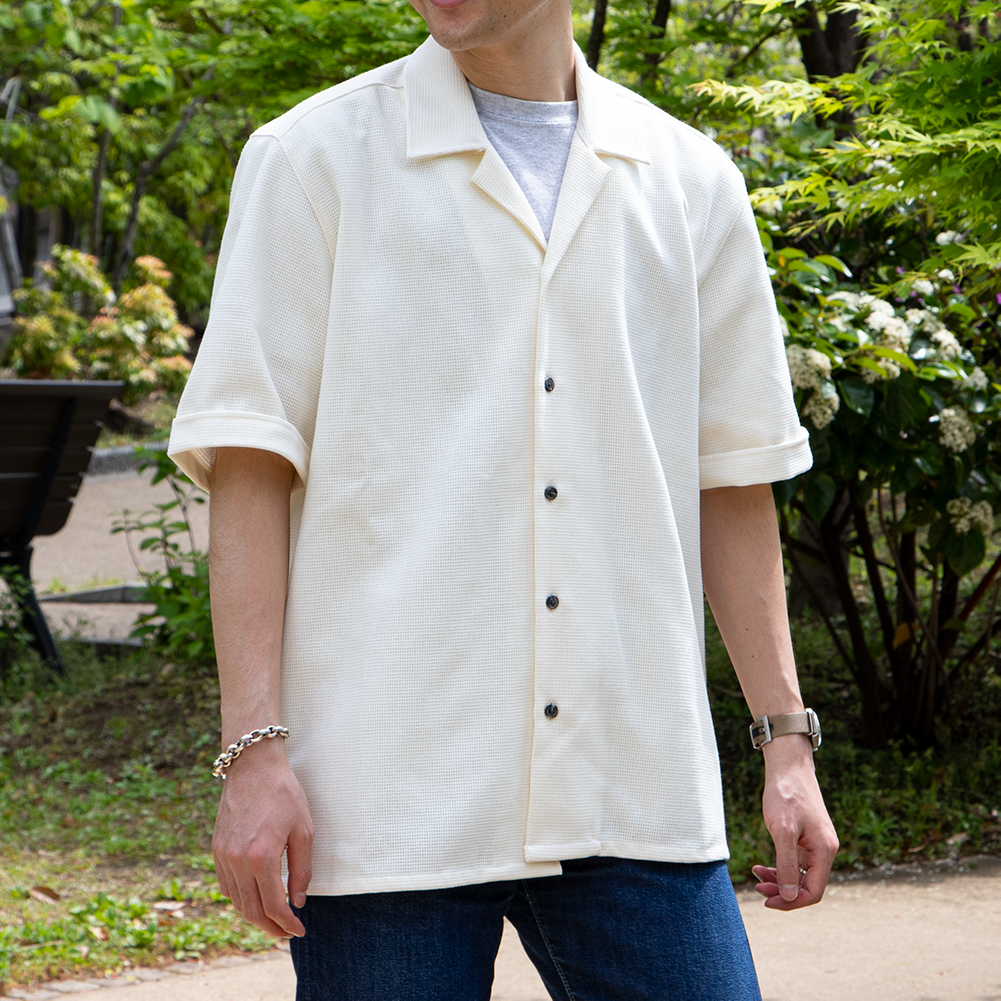 最大の特徴は何といってもバスケット織のメッシュ生地。 涼しげな透け感のある生地のアイテムは近年人気が高まっていますね。 デザインは開襟のキューバシャツ。フロントに特徴的な柄のないシンプルなデザインとなっています。