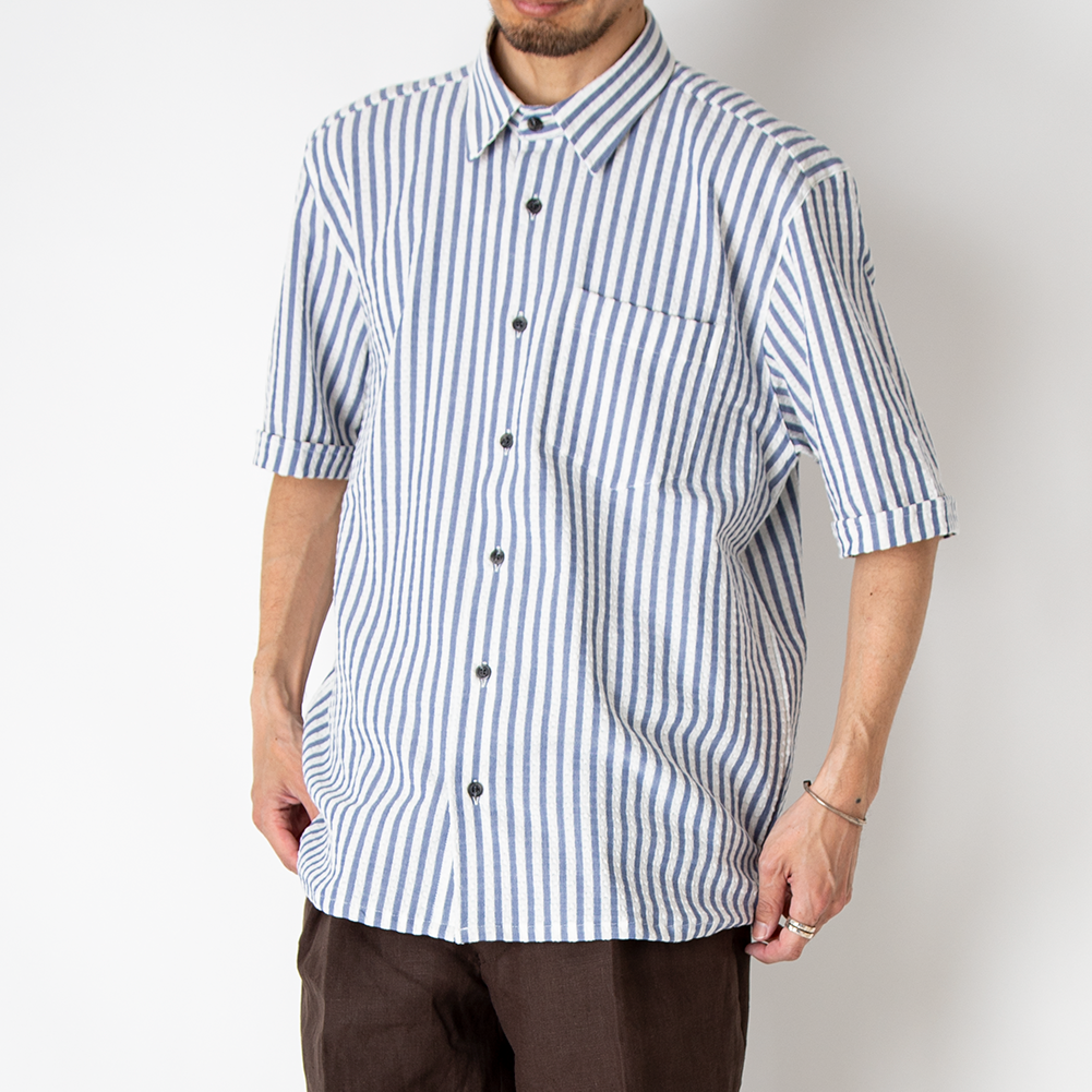 シアサッカー生地のブルーストライプ、特徴的な柄・配色のキャンディーストライプの2色入荷しました。 どちらも存在感のある柄ですので、Tシャツの上に羽織るだけでも◎。