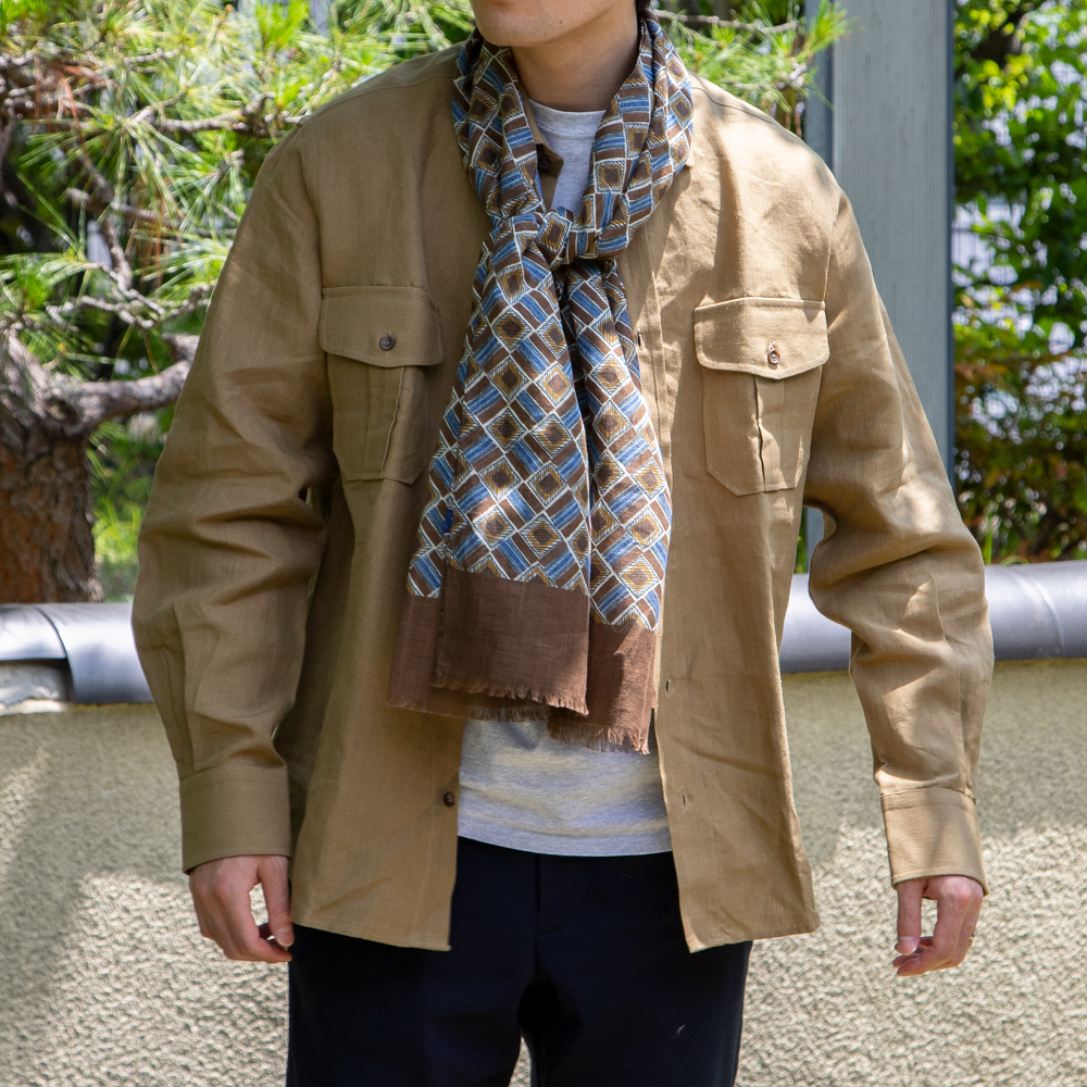 モデル:173センチ ネッカチーフサイズ:65×65 シャツサイズ:15Vincenzo Miozza 65×65 コットンリネン スカーフ JF044248 Col.3【UNISEX】 ¥13,200 (税込)
