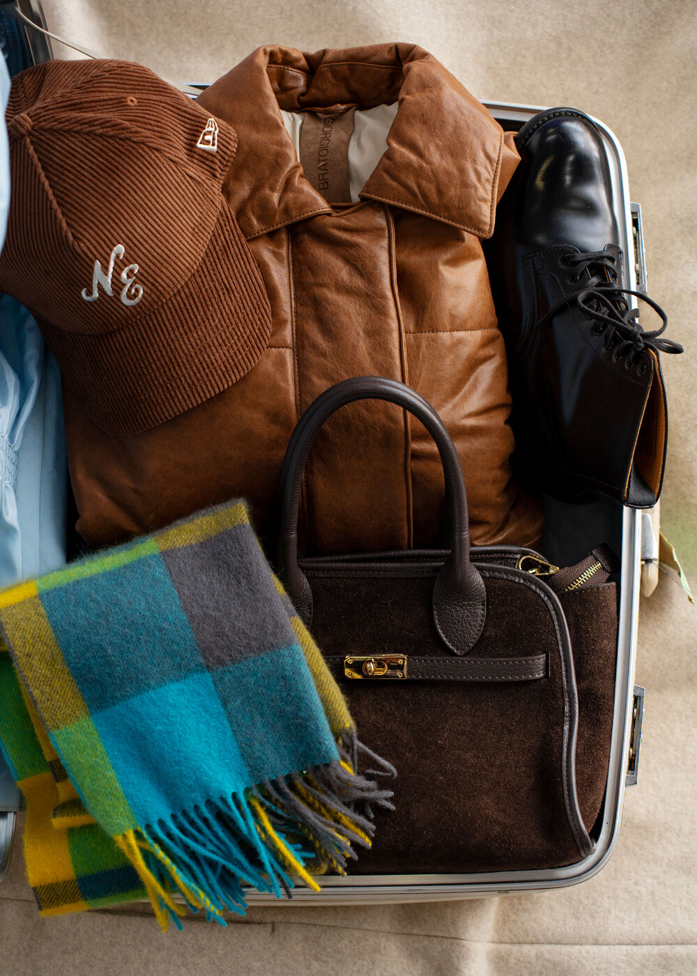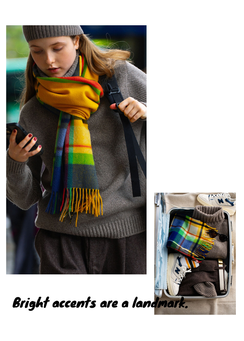 タータンチェックをベースに、色鮮やかなイエローカラーが、暗くなりがちなコーディネートを華やかに彩る。